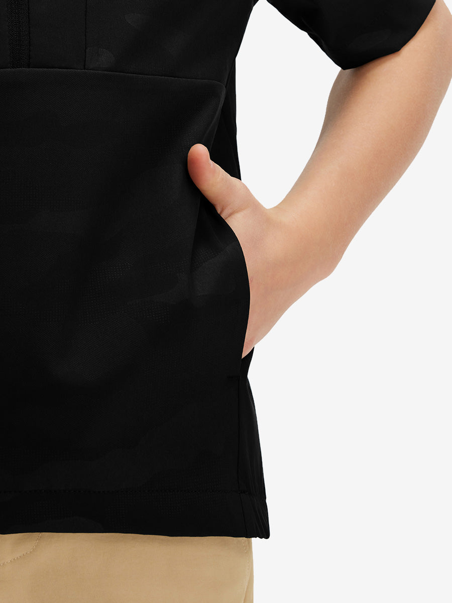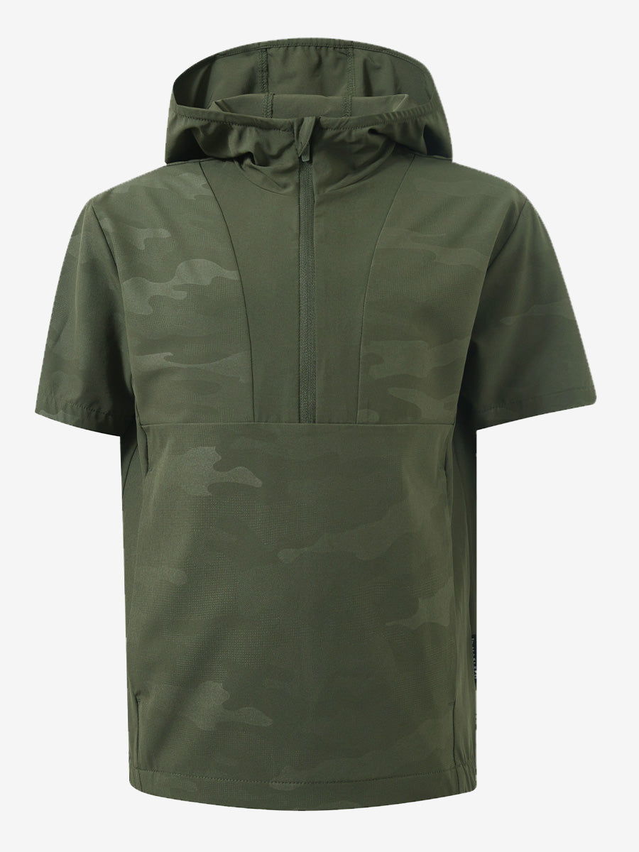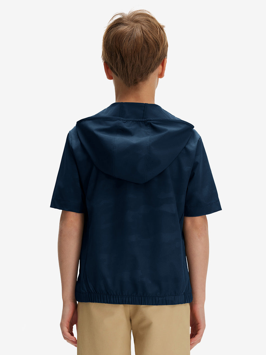 Mantén a tu hijo seco y cómodo con nuestra Sudadera con capucha de manga corta con cremallera y resistente al agua. Fabricada con un tejido ligero, transpirable y de secado rápido que es suave para la piel, ofrece comodidad durante todo el día. El protector de barbilla protege al subir la cremallera, mientras que dos bolsillos delanteros seguros guardan teléfonos y artículos esenciales, ¡perfecta para la diversión activa al aire libre!